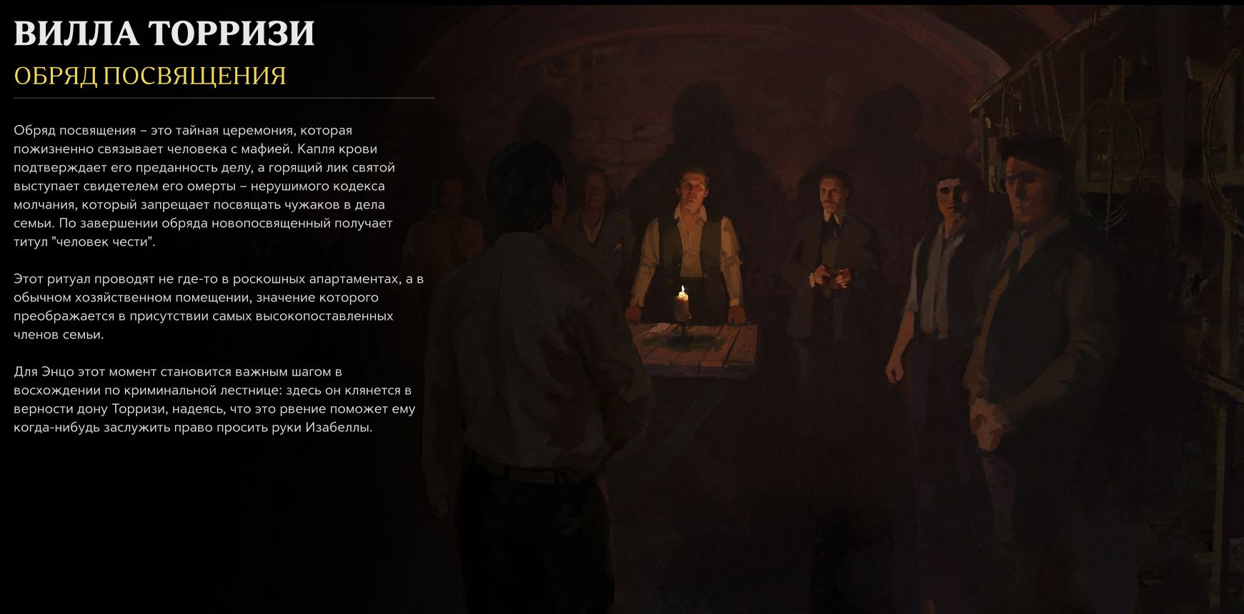 Обряд посвящения это тайная церемония, которая пожизненно связывает человека с мафией. Капля крови подтверждает его преданность делу, а горящий лик святой выступает свидетелем его омерты нерушимого кодекса молчания, который запрещает посвящать чужаков в дела семьи. По завершении обряда новопосвященный получает титул "человек чести".