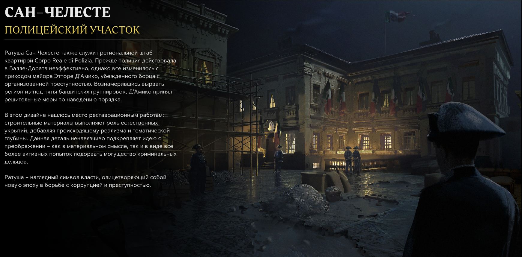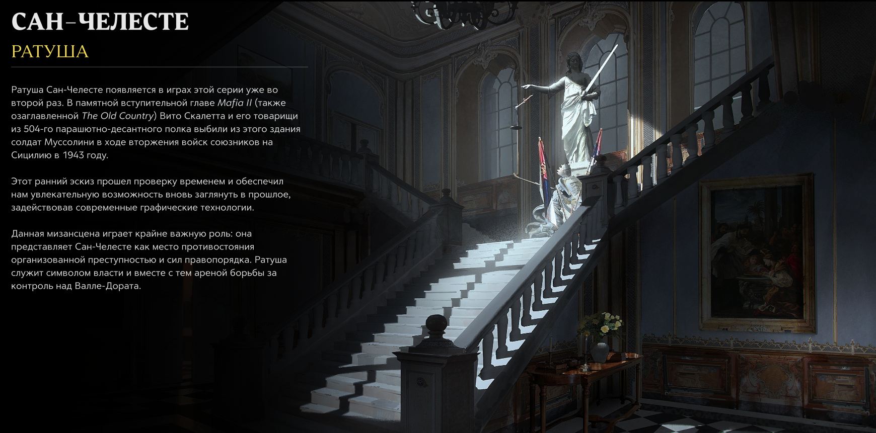 Ратуша Сан-Челесте появляется в играх этой серии уже во второй раз. В памятной вступительной главе Mafia II (также озаглавленной The Old Country) Вито Скалетта и его товарищи из 504-го парашютно-десантного полка выбили из этого здания солдат Муссолини в ходе вторжения войск союзников на Сицилию в 1943 году.