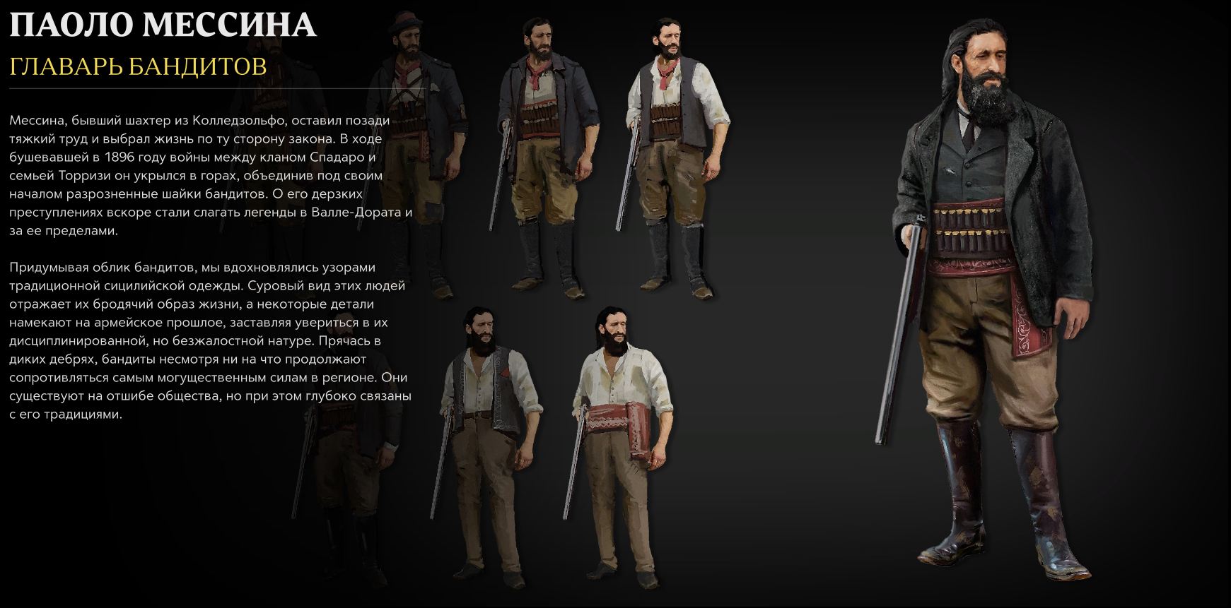 Придумывая облик бандитов, мы вдохновлялись узорами традиционной сицилийской одежды. Суровый вид этих людей отражает их бродячий образ жизни, а некоторые детали намекают на армейское прошлое, заставляя увериться в их дисциплинированной, но безжалостной натуре. Прячась в диких дебрях, бандиты несмотря ни на что продолжают сопротивляться самым могущественным силам в регионе. Они существуют на отшибе общества, но при этом глубоко связаны с его традициями.