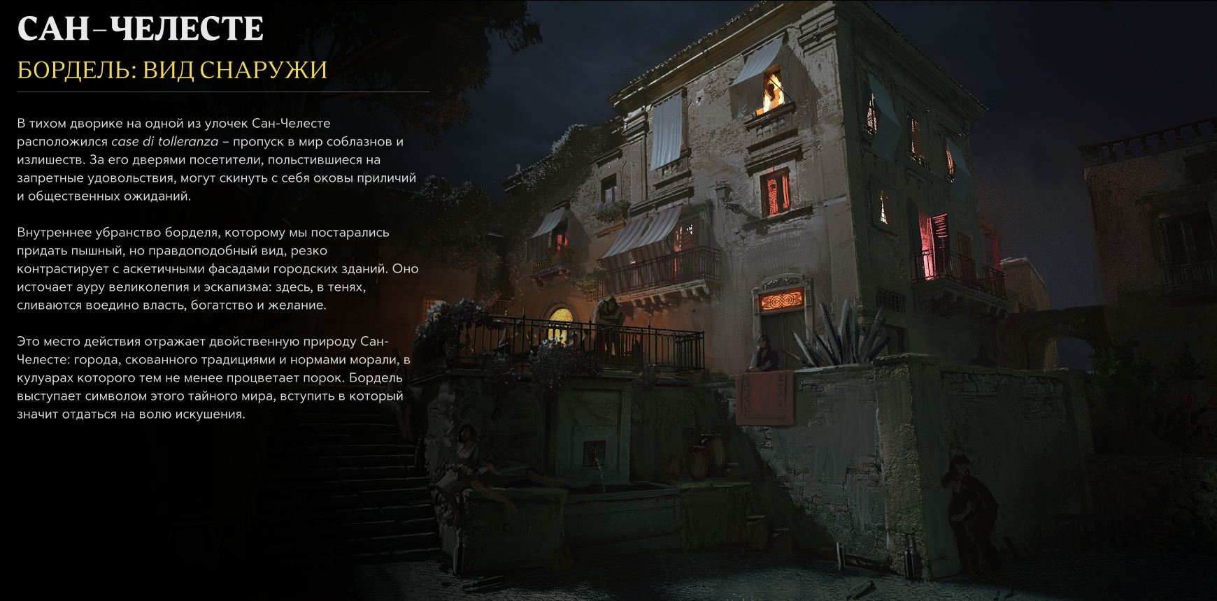 Мы проследили за тем, чтобы бордель хорошо вписался в пейзаж Сан-Челесте. Он служит заманчивым и в то же время правдоподобным прибежищем развлечений, в облике которого роскошь сочетается с упадком.