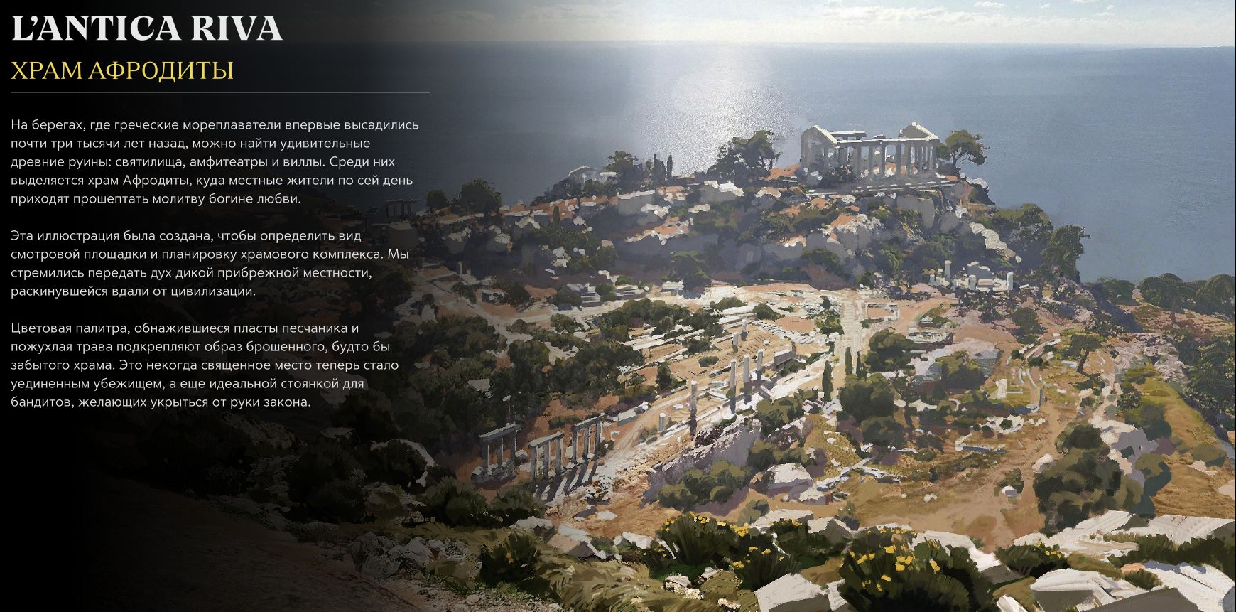 Эта иллюстрация была создана, чтобы определить вид смотровой площадки и планировку храмового комплекса. Мы стремились передать дух дикой прибрежной местности, раскинувшейся вдали от цивилизации.