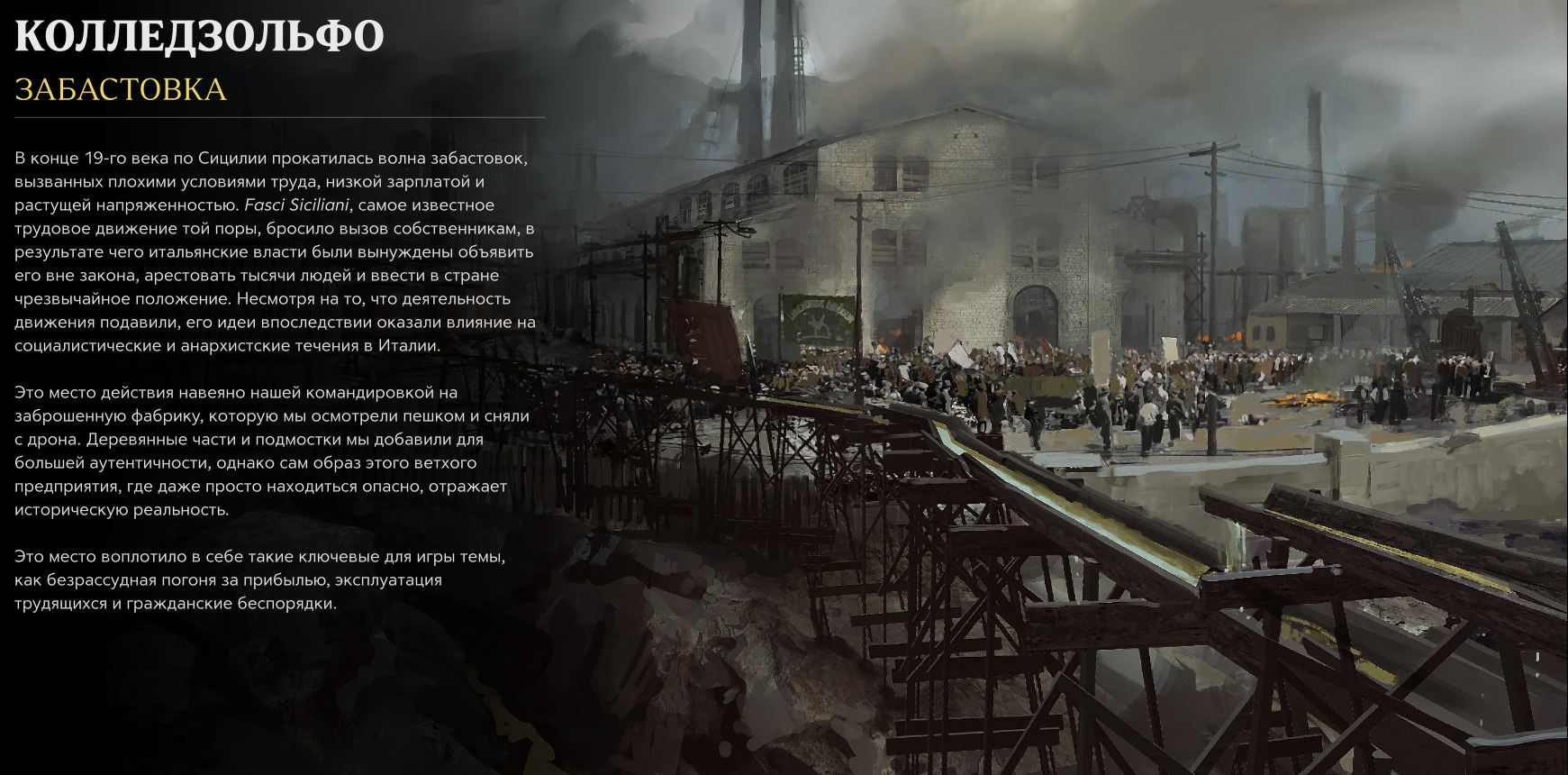 Это место действия навеяно нашей командировкой на заброшенную фабрику, которую мы осмотрели пешком и сняли с дрона. Деревянные части и подмостки мы добавили для большей аутентичности, однако сам образ этого ветхого предприятия, где даже просто находиться опасно, отражает историческую реальность.