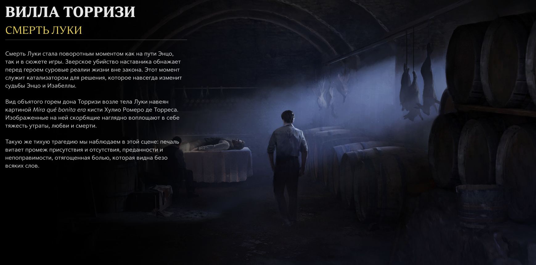 Смерть Луки стала поворотным моментом как на пути Энцо, так и в сюжете игры. Зверское убийство наставника обнажает перед героем суровые реалии жизни вне закона. Этот момент служит катализатором для решения, которое навсегда изменит судьбы Энцо и Изабеллы.