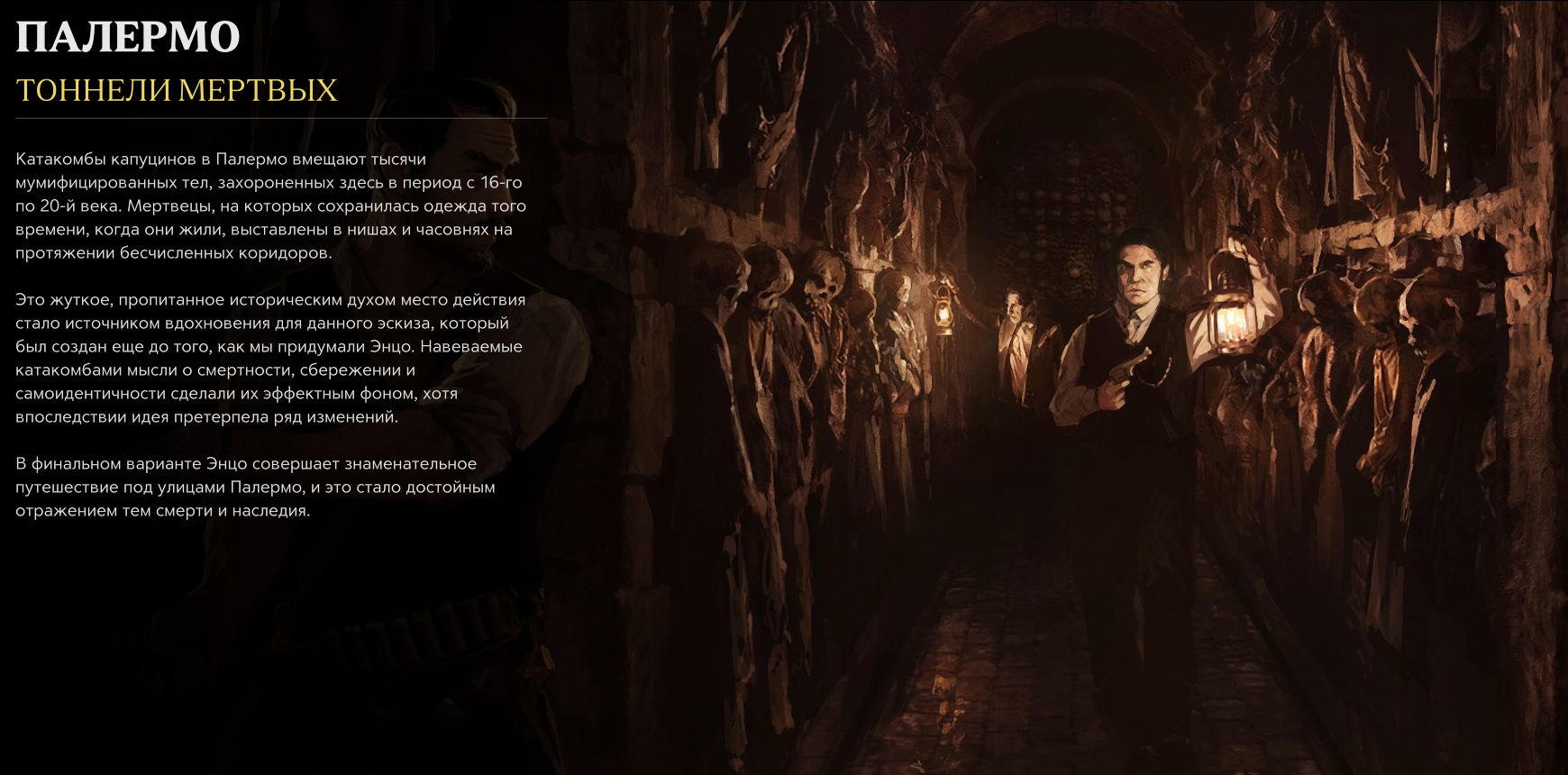 Это жуткое, пропитанное историческим духом место действия стало источником вдохновения для данного эскиза, который был создан еще до того, как мы придумали Энцо. Навеваемые катакомбами мысли о смертности, сбережении и самоидентичности сделали их эффектным фоном, хотя впоследствии идея претерпела ряд изменений.