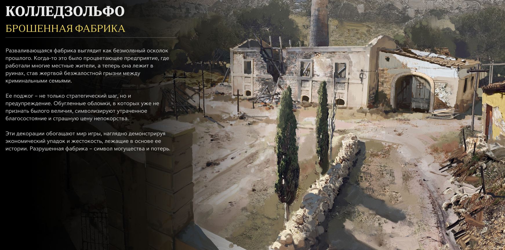 Эти декорации обогащают мир игры, наглядно демонстрируя экономический упадок и жестокость, лежащие в основе ее истории. Разрушенная фабрика символ могущества и потерь.
