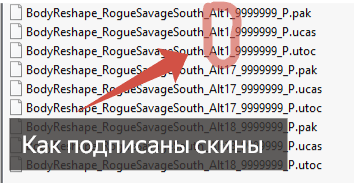 - Выберите вариант скина из архива, 3 файла с окончанием pak, ucas, utoc. Каждый вариант скина подписан Alt1,Alt17,Base3 и т.д.