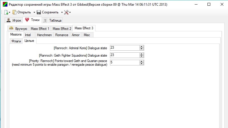 В последней, которую я нашла на сайте, открываем свое сохранение, "Точки", потом "Mass Effect 3" и "Целые". Вот в "Целые" есть три строчки. Можно просто проставить в каждую по сотне очков, тогда должно сработать. Как-то так.