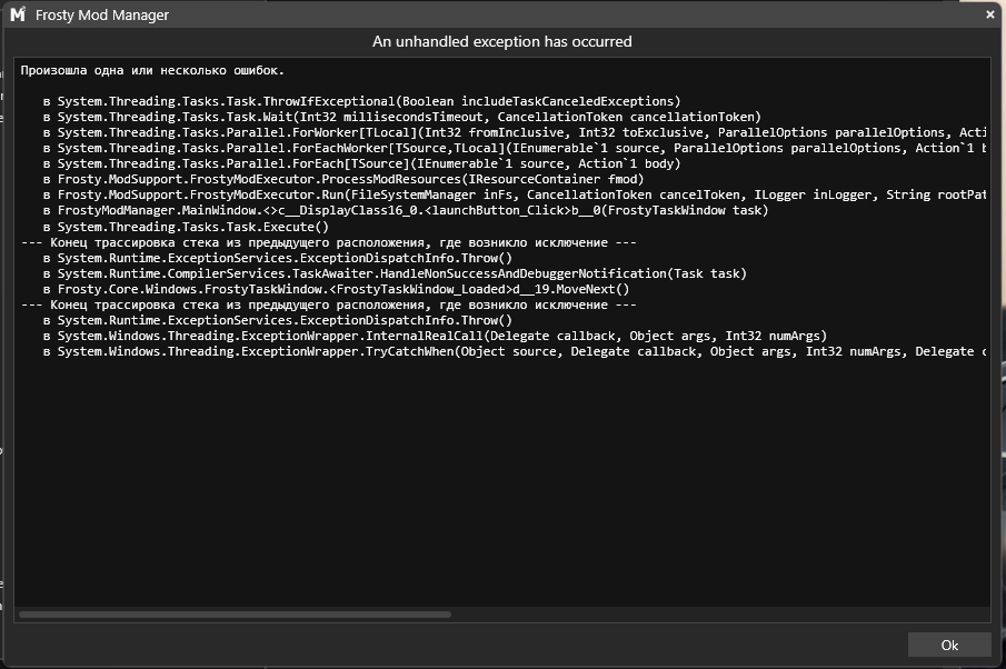 Хелп! Все сделал по инструкции, после запуска Launch через FrostyModManager, после окна загрузки модов выдает ошибку, скрин ниже :(