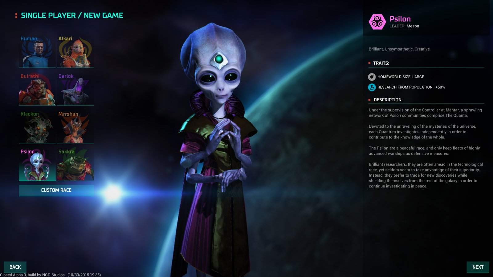 Псилоны — небольшие и мягкие существа. Из-за малых физических размеров и пассивности многие расы считают их слабыми. Но псилоны готовы поставить на кон свою жизнь, если это понадобится ради исследования. Когда случаются катастрофы, псилоны остаются в лабораториях и стараются спасти как можно больше своих наработок. Раса сконцентрирована на работе и зачастую не замечает мир вокруг себя. У псилонов врождённое отторжение конфликтов, а потому преступности и актов физического насилия у них почти не бывает.