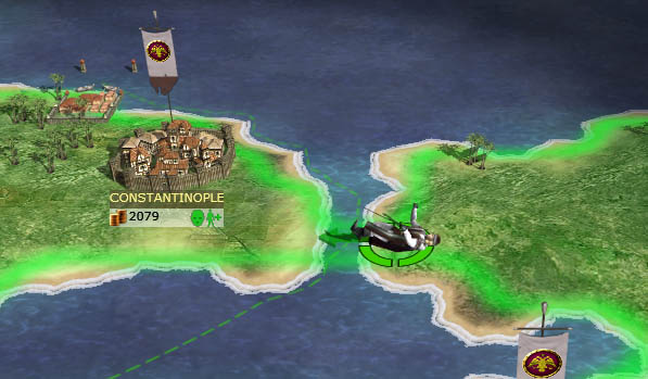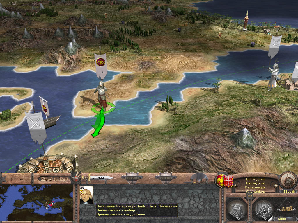 Если нашелся такой агент, который ну просто вас раздражает своей некомпитентностью и просто занимает место. Вместо этого неудачливого агента можно было бы обучить нового более молодого и проворного. Если такой нашелся, то подводим его к месту где с одного материка проходит зеленая стрелка на другую, т.е. агент или полководец проходит через водные просторы.