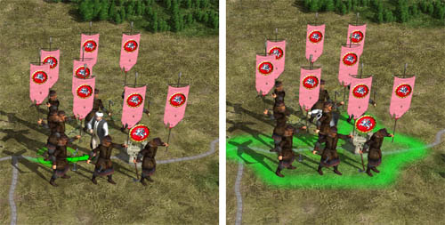 Я в качестве жертвы выбрал посла Бандитов. После того как щелкнуть по нему ЛКМ и удерживать кнопку, то покажется желтым области куда он может попасть за один ход. Т.е. сколько не ставь на него отряд, он так и будет бегать и даже если у него кончатся пункты передвижения.