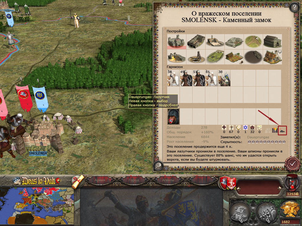 Целью нашего проникновения стал замок Смоленск, за стены которого наш лазутчик проходит не замеченным и начинает распространять заразу. Как видим мы на скрине операция прошла успешна и в замке полным ходом идет очистка улиц от зараженных тел отважными горожанами Смоленска. Лазутчика лучше не убирать с замка, иначе эффект пропадет быстрее, а так и мор будет губить жителей замка и лазутчик каждый ход посылает вам сведения о враждебном поселении. Для большего эффекта можно осадить поселение, дабы лишить возможность переобучения отрядов.