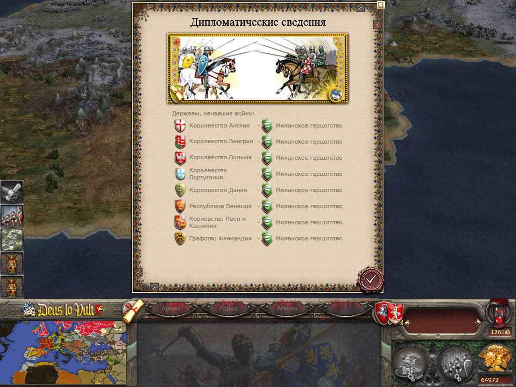 Мод "Deus lo Vult" - В течении 50-ти лет Милан воевал со всем католическим миром, т.е. захватчики приходили на его территорию, а он их прогонял. Несколько раз захватывал Рим, но его постоянно выкидывали от туда. Милан так никто и не смог захватить, только вот однажды Милан объявил и мне войну, это ошибка для нее стала фатальной и я уничтожил ее вместе со всеми ее врагами =)