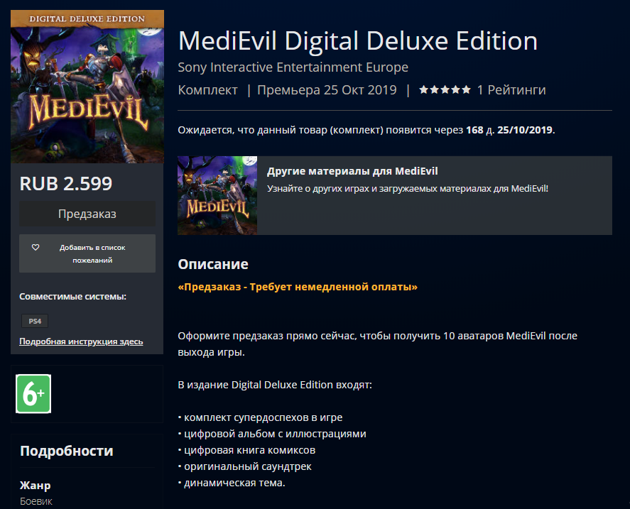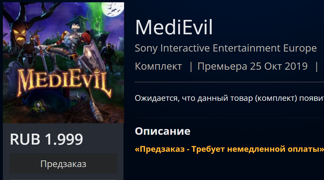 В playstation store стал доступен предзаказ игры MediEvil. Премьера состоится 25 октября 2019 года. Цена обычной версии составляет 1990 рублей. Так же в продаже имеется издание Digital Deluxe Edition стоимостью в 2599 рублей, в которое по мимо вышеупомянутой игры, входят следующие бонусы.