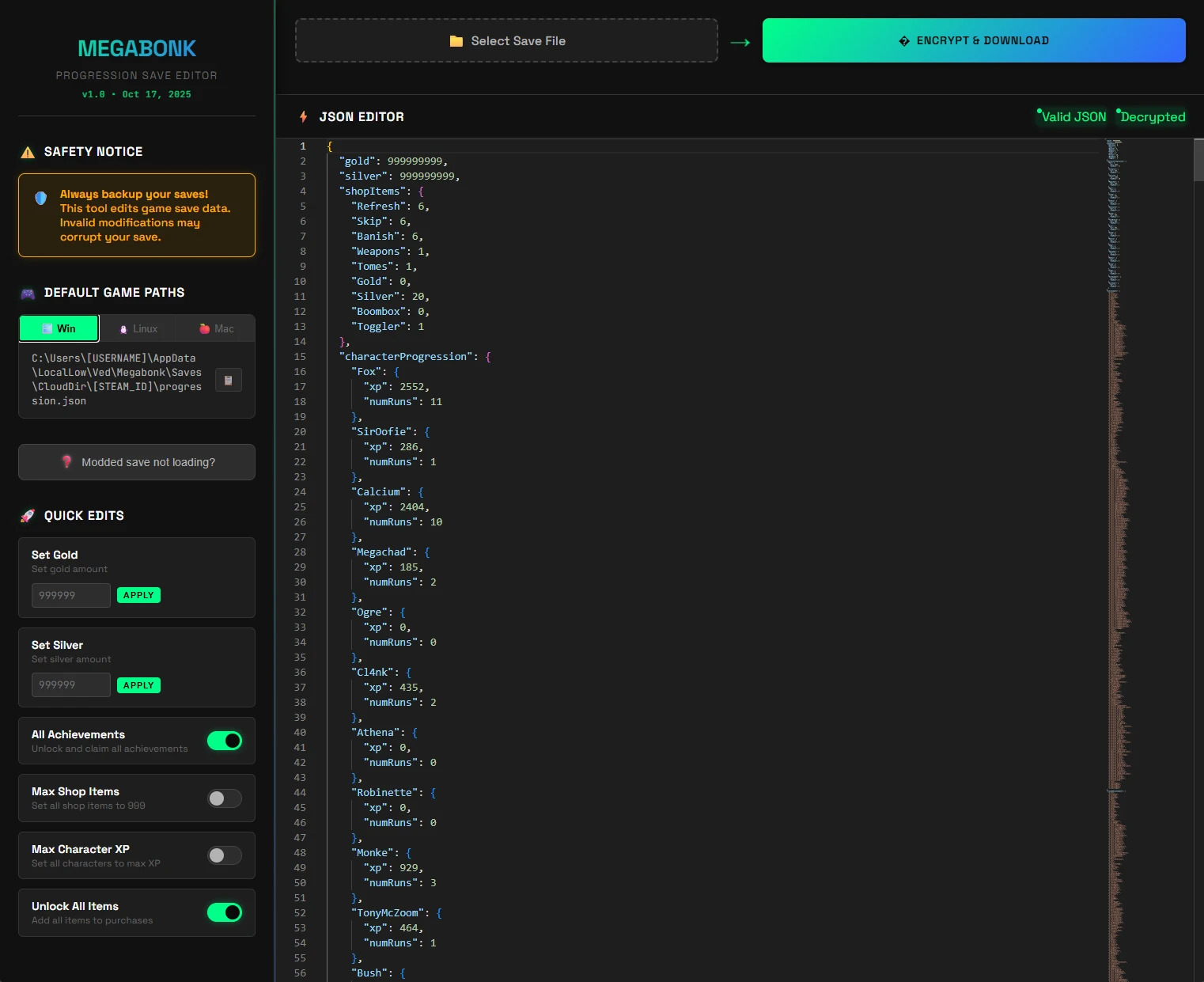 Это лёгкий веб-редактор сохранений для игры Megabonk. Работает на любой платформе.