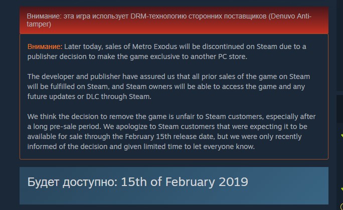 Metro Exodus стала эксклюзивом магазина создателей Fortnite. На странице игры в Steam вышло вот такое сообщение от разработчиков. Все кто предзаказал игру, смогут играть в Steam и получать обновления с дополнениями и патчами, а новые покупатели не смогут купить игру. Напомню, многие разработчики переходят в магазин Epic Game Store из-за того, что она взымает только 12% от продаж.