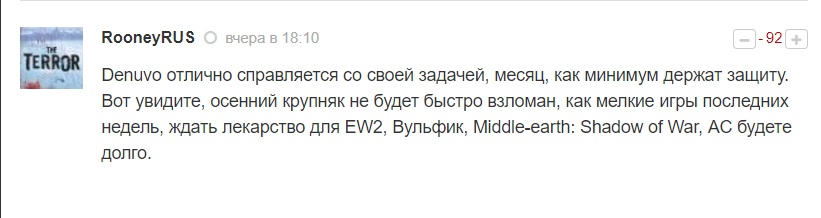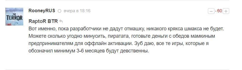 kung fu master Тут дело не в защите, а в том что народ с большей охотой скачет игру, издатель которой считает нормальной практикой, вводить в игру доп платежи, вместо того что бы наполнять ее интересным контентом. И я бы больше боялся не новых методов защиты, это не критично, если продукт достойный всегда можно поскрести по сусекам и приобрести игру. А того что микротранзакции во всех проектах ААА уровня, пойду в комплекте с доп платежами. И ведь речь не о пресловутых ДЛС качество которых страдает с каждым годом. А лутбоксах в которые тыкают носом на протежении всей игры, и делают так, что бы геймплей без них был не комфортным. P.S: И не сочти что я оправдываю себя, как пирата, я не считаю нормой, в свои годы качать игры. Благо ценовая политика стим и различных ритейлеров, позволяет приобретать игры не за баснословные 60$ как в европейских магазинах. Но все же, внося свою копейку в карман издателю я ожидаю полноценный продукт, в который не потребуется вносить еще денег, не вопрос пусть игра будет стоить не 2к а 3-4к. Но пусть это будет полноценный продукт, в который еще не потребуется заносить, как в какую нибудь FTP гриндилку.