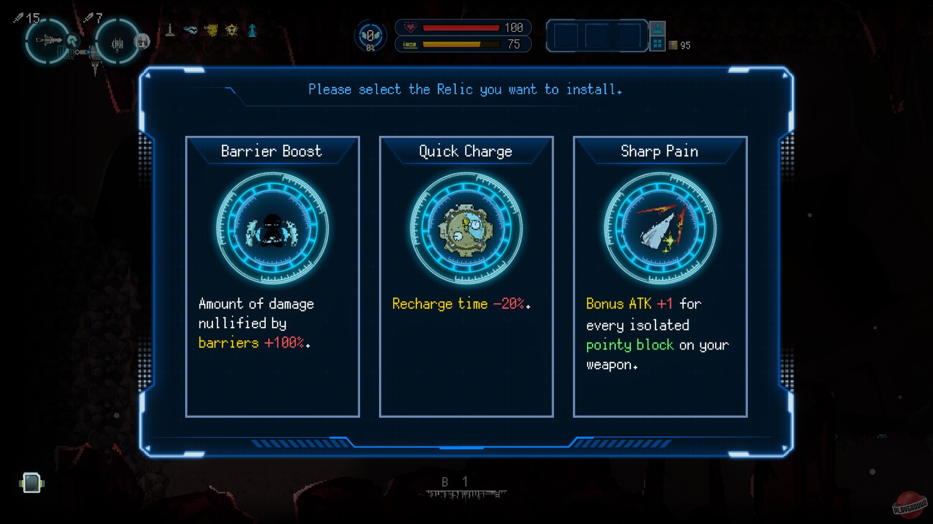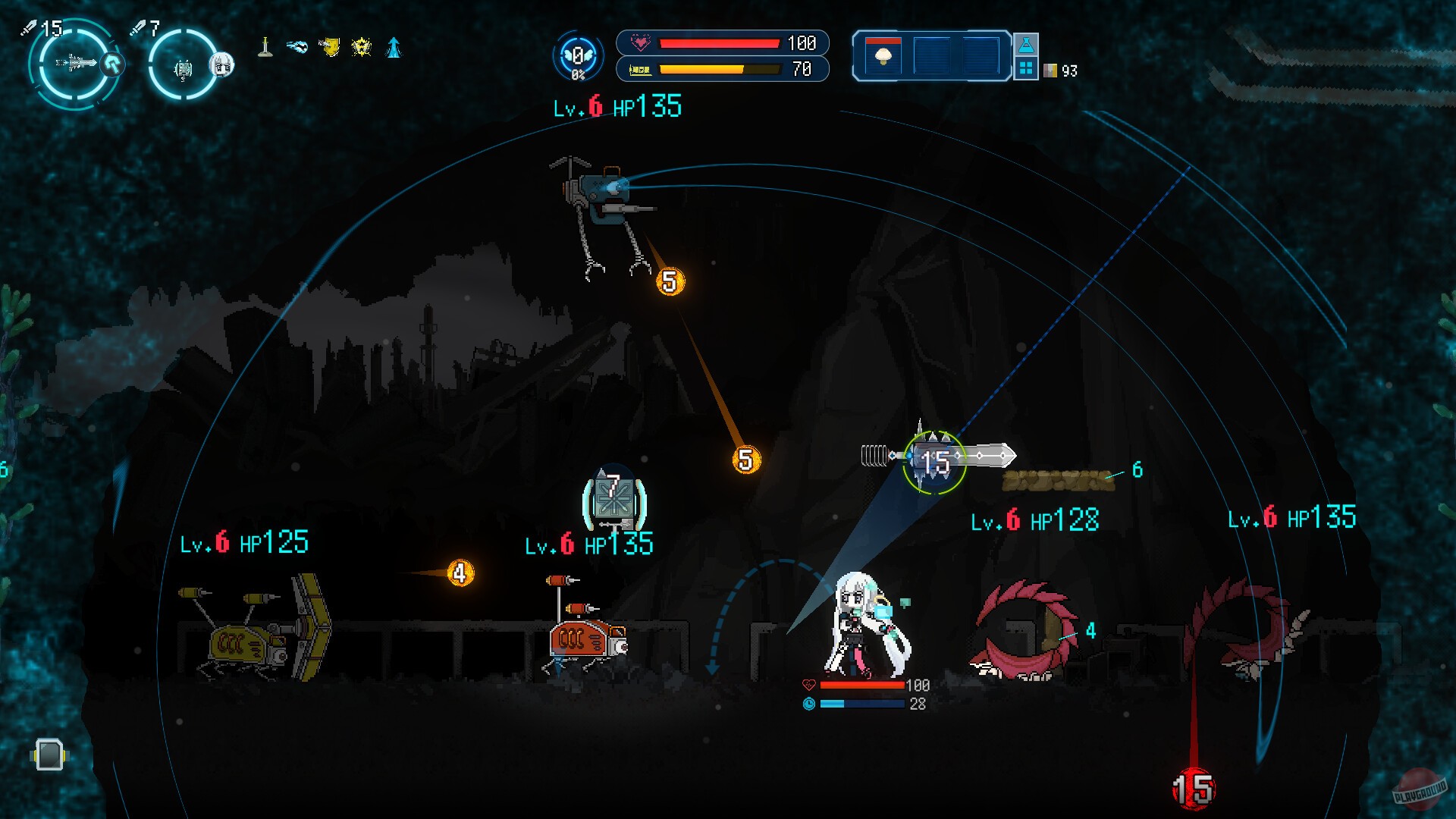 Главная фишка игры — устройство под названием «биотопный глушитель», которое останавливает время вокруг Момы, пока она стоит неподвижно. Враги тоже замирают, и можно спокойно обдумать, как выбираться из окружения или планировать атаку. Довольно-таки удобно, особенно учитывая, что оружие и щиты в игре имеют прочность и ломаются в бою. Пока чинишь экипировку, Мома становится совершенно беззащитной, вот тут и пригождается возможность заморозить всех врагов. А ещё в игре оружие и броню создаёшь сам из разных блоков — система похожа на пиксель-арт. Блоки можно комбинировать как угодно, создавая всё от дальнобойных пушек до крепких щитов. Некоторые блоки даже улучшаются, если поставить рядом такие же.