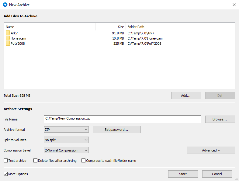 - Запустите Bandizip → Новый архив → Добавить... → Выберите файлы для сжатия→ Открыть → Настройки архива (Задайте имя и путь архива) → Начать → Закрыть