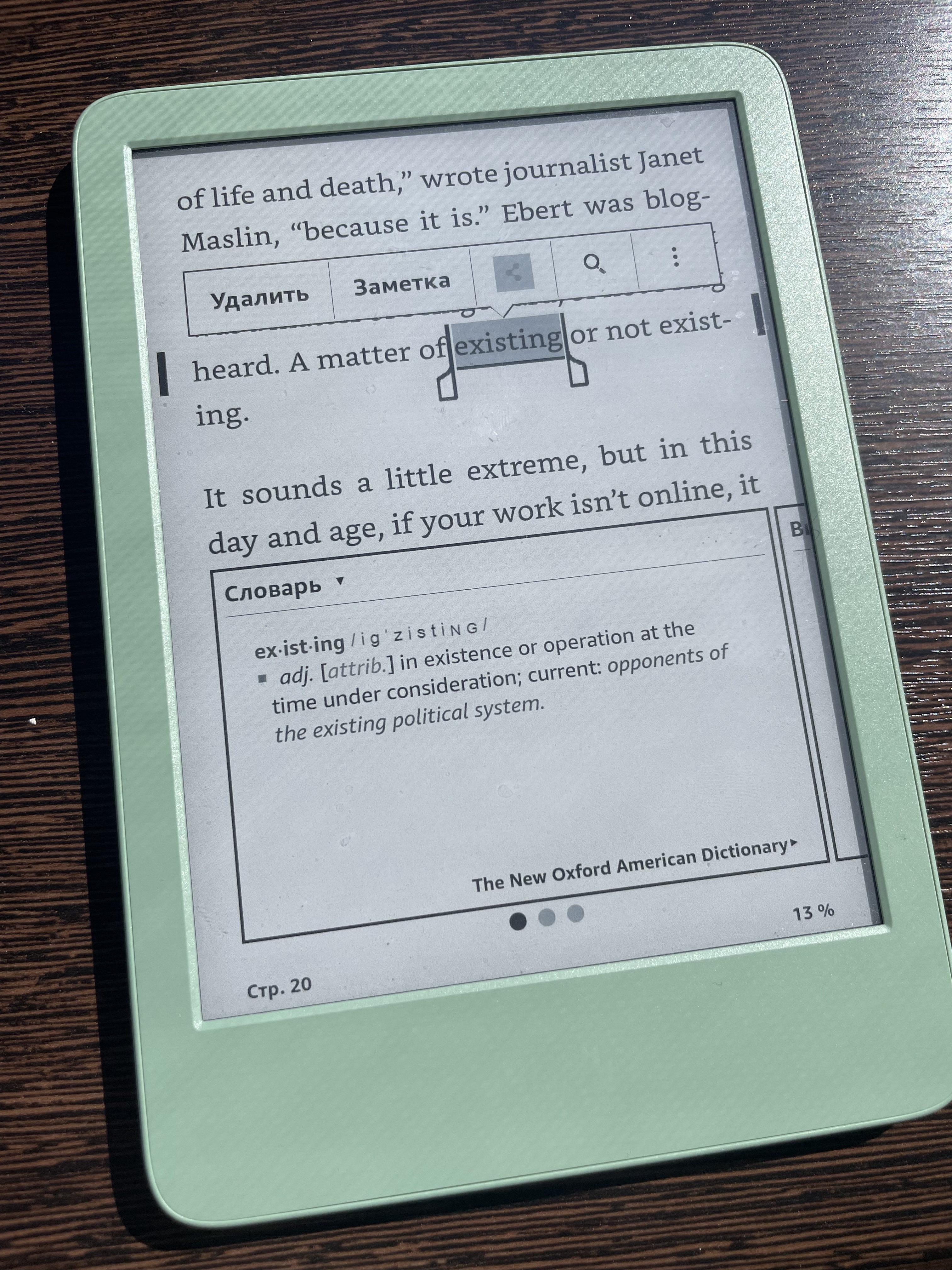 Началось все с книжек, конечно. Я с детства люблю читать, но теперь мне предстояло полюбить читать на английском языке. Так, я начал качать книжки на свою читался Kindle теперь и на английском. Читать получалось раз в 5 медленнее чем на русском, но через неделю стало лучше, привык что-ли. Сильно выручала функция экранного словаря в Киндле, позволяющая получать значение неизвестных слов прямо в читалке.