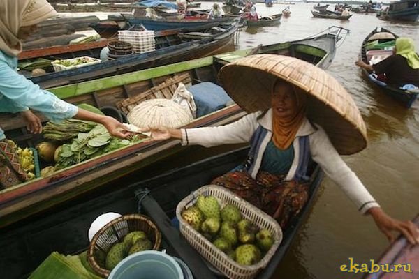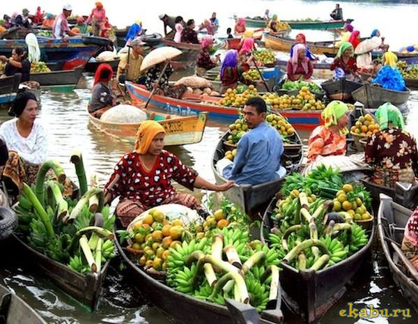В индонезийском городе Банджармасин есть необычный базар на реке. Торговцы используют собственные лодки в качестве прилавков, а посетители рынка и покупатели передвигаются на лодках от одного торговца к другому.