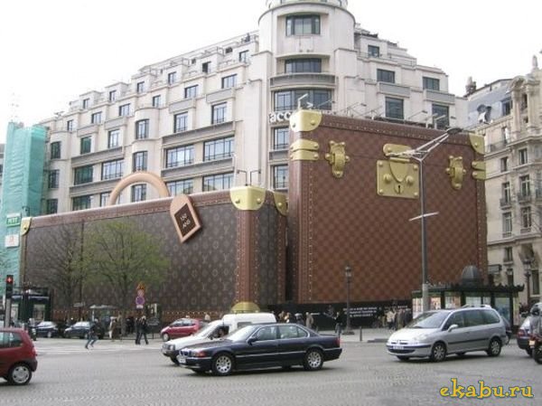 К празднованиям своего 150-летия Louis Vuitton решил обновить свой главный магазин в Париже. Огромные чемоданы в личном стиле были установлены на период реставрации