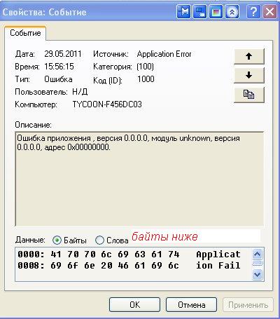 в байтах я так понял захексенное сообщение Application Failure 0.0.0.0 in unknown 0.0.0.0 at offset 00000. Его не пробовал вбивать в поиск?