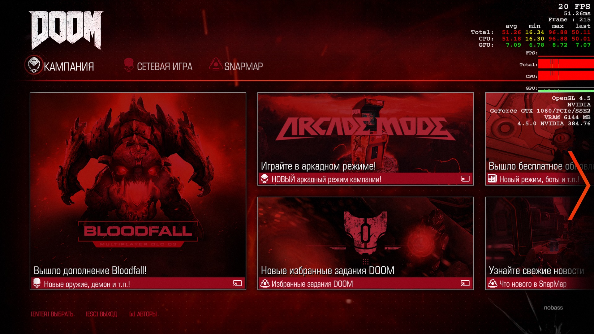 Первым делом решил проверить на Doom 4. Всё летало на ультре. Но на след день вдруг стала жутко лагать. Я грешил, что стала включаться встроенная карта, но дело не в этом. В статистике игра пишет, что загружен проц на 100%. (см скрин). Перед самой загрузкой игры *на чёрном экране) появляется курсор винды и явно что-то ещё запускает. Вирусов нет. Дрова новые. Игру переустанавливал.