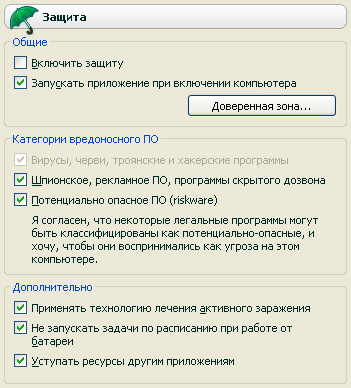 1) Нажимаем на раздел "Защита" => везде должны стоять галки, в том числе и на "Потенциально опасное ПО (riskware)":
