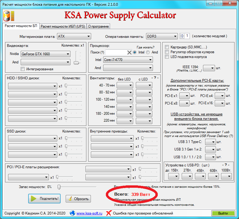 Приблизительно прикинул по мощности указанный в теме конфиг (4770 +1660), но тут не учитывается остальная комплектуха - диски, кулеры, кол-во модулей памяти и т.п., без этого трудно подсчитать мощность более точно.