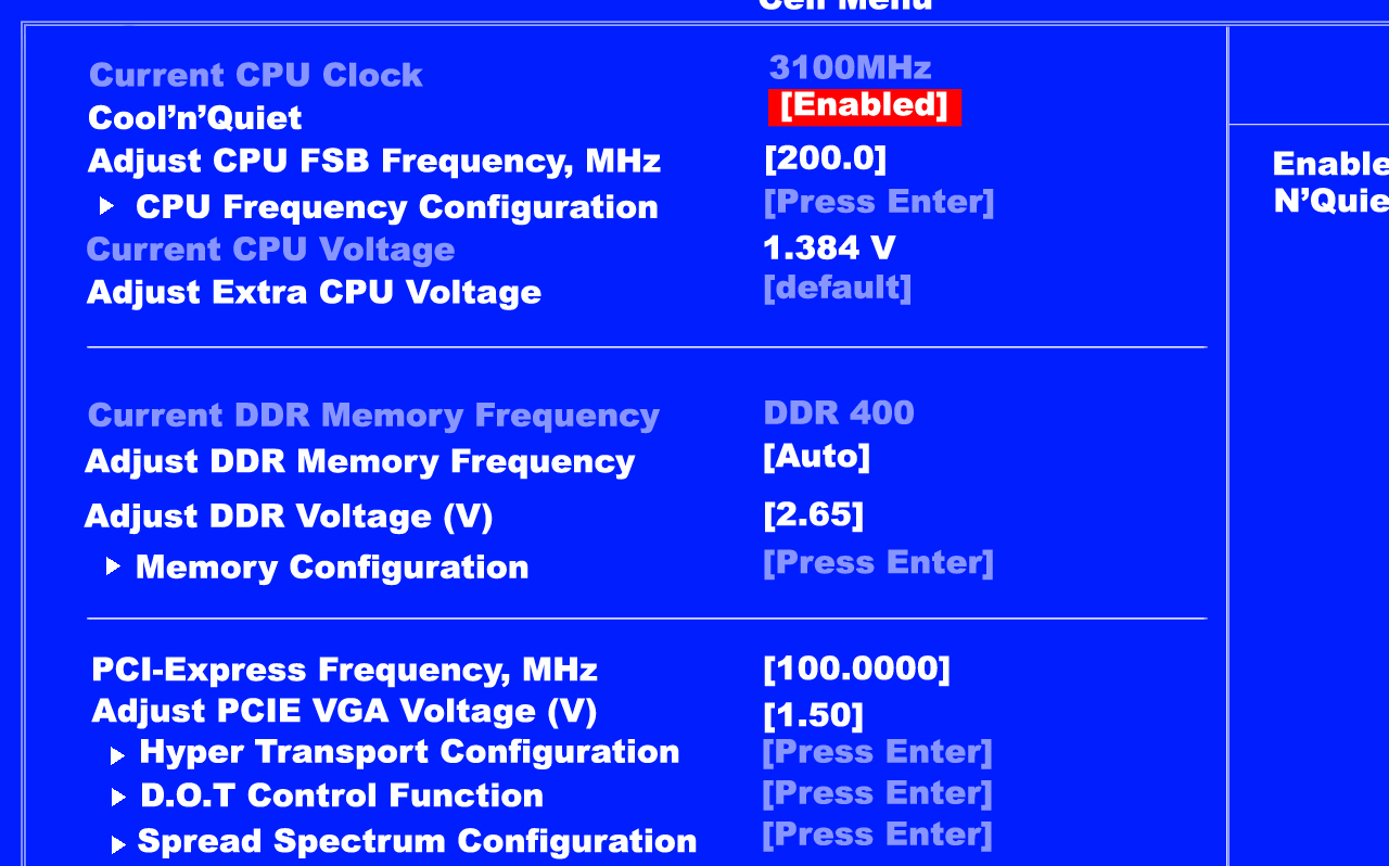 необходимо иметь качественный блок питания, иначе из-за нехватки питания или его нестабильности вы можете расстаться с некоторым количеством узлов вашего компьютера;необходимо позаботиться и о качественном охлаждении процессора, т.к. с увеличением потребления энергии увеличится и теплоотдача процессора;мы будем изменять характеристики, которые иногда могут отсутствовать в старых версиях BIOS. Поэтому проверьте – все ли параметры присутствуют в меню BIOS, и если нет, то предварительно скачайте и установите самую последнюю версию BIOS’а для вашей материнской платы;увеличение FSB приведет к увеличению частоты работы памяти (ОЗУ), следовательно, и установленные модули памяти должны отличаться быстротой и качеством.