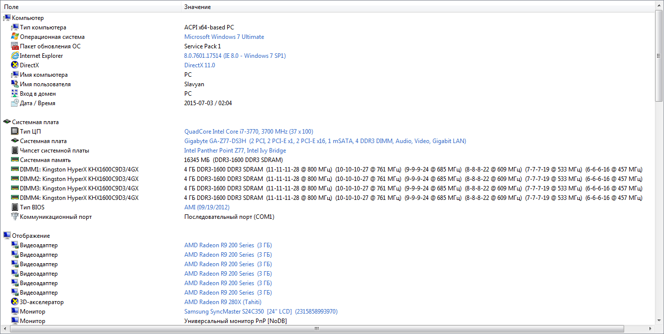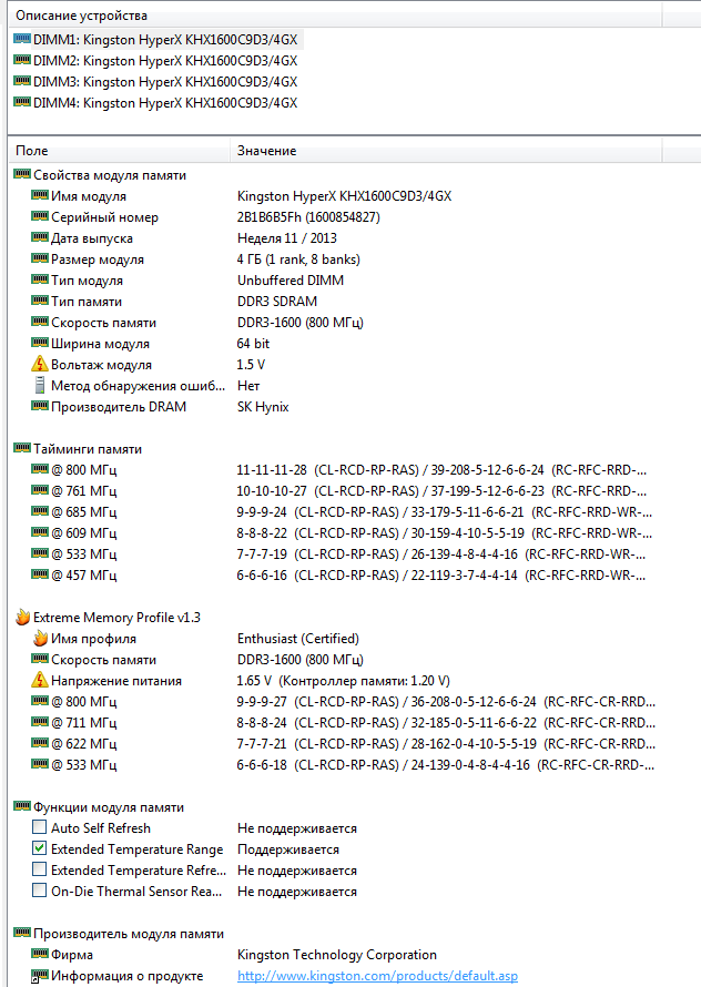 DIMM1: Kingston HyperX KHX1600C9D3/4GX 4 ГБ DDR3-1600 DDR3 SDRAM (11-11-11-28 @ 800 МГц) (10-10-10-27 @ 761 МГц) (9-9-9-24 @ 685 МГц) (8-8-8-22 @ 609 МГц) (7-7-7-19 @ 533 МГц) (6-6-6-16 @ 457 МГц)