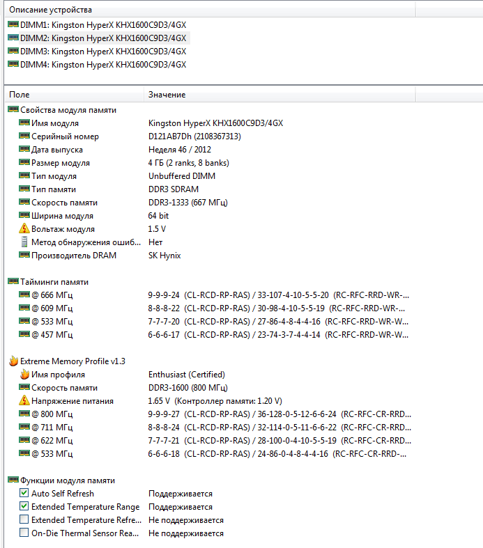 DIMM2: Kingston HyperX KHX1600C9D3/4GX 4 ГБ DDR3-1333 DDR3 SDRAM (9-9-9-24 @ 666 МГц) (8-8-8-22 @ 609 МГц) (7-7-7-20 @ 533 МГц) (6-6-6-17 @ 457 МГц)