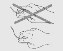 • класть указательный палец на левую кнопку, средний — на правую, а безымянный прижимать к боковой грани мыши;