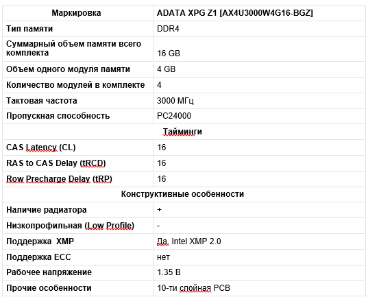 • Memory: ADATA XPG Z1 (AX4U3000W4G16-QGZ) 16 GB (4 Гб x4)