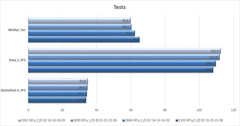В играх - прирост производительности будет ощутимо заметен, когда узким местом не будет являться видеокарты (см. графики). Кроме того, как я упоминал выше, для игр желательно иметь ОЗУ объемом от 4 Гигабайт и выше. До этого я играл в Dota2 на системе с 2 Gb ОЗУ. Конечно же этого было недостаточно, и игрушка периодически «лагала». После установки комплекта жить стало легче, периодические подергивания и проседания FPS ушли. Повышение частоты и уменьшение задержек модулей позволяют получит где-то 4-7% прироста в Dota2, и убрать все лаги.