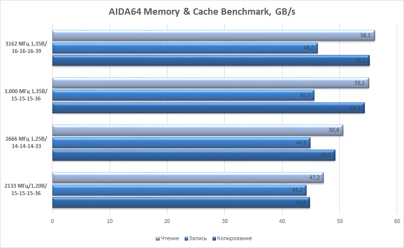 Как видно из таблицы DDR4-2133 МГц и DDR4-3000 МГц я использовал согласно предустановленным профилям, а для скорости DDR4-2666 МГц тайминги и напряжение были подобраны экспериментально при напряжении 1.35 В.