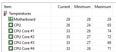 Компьютеру у меня полтора года, никогда проблем с температурой не было, вчера ставил на ночь игру качаться, bf4,сегодня запускаю, и вижу в ней температуру 80 градусов, хотя раньше в играх никогда не поднималась выше 70, в ведьмаке 3 было 64. Разобрал комп, вытряс пыль, заменил термопасту, но ничего особо не поменялось. В Биосе тоже почему-то показывает 70градусов. Делал стресс аидой подучил 97градусов,да ещё и комп тормозить начал. Паста мх-4. В стресс тесте раньше было 70-80. В простое щас 33,но временами скачет до 40.