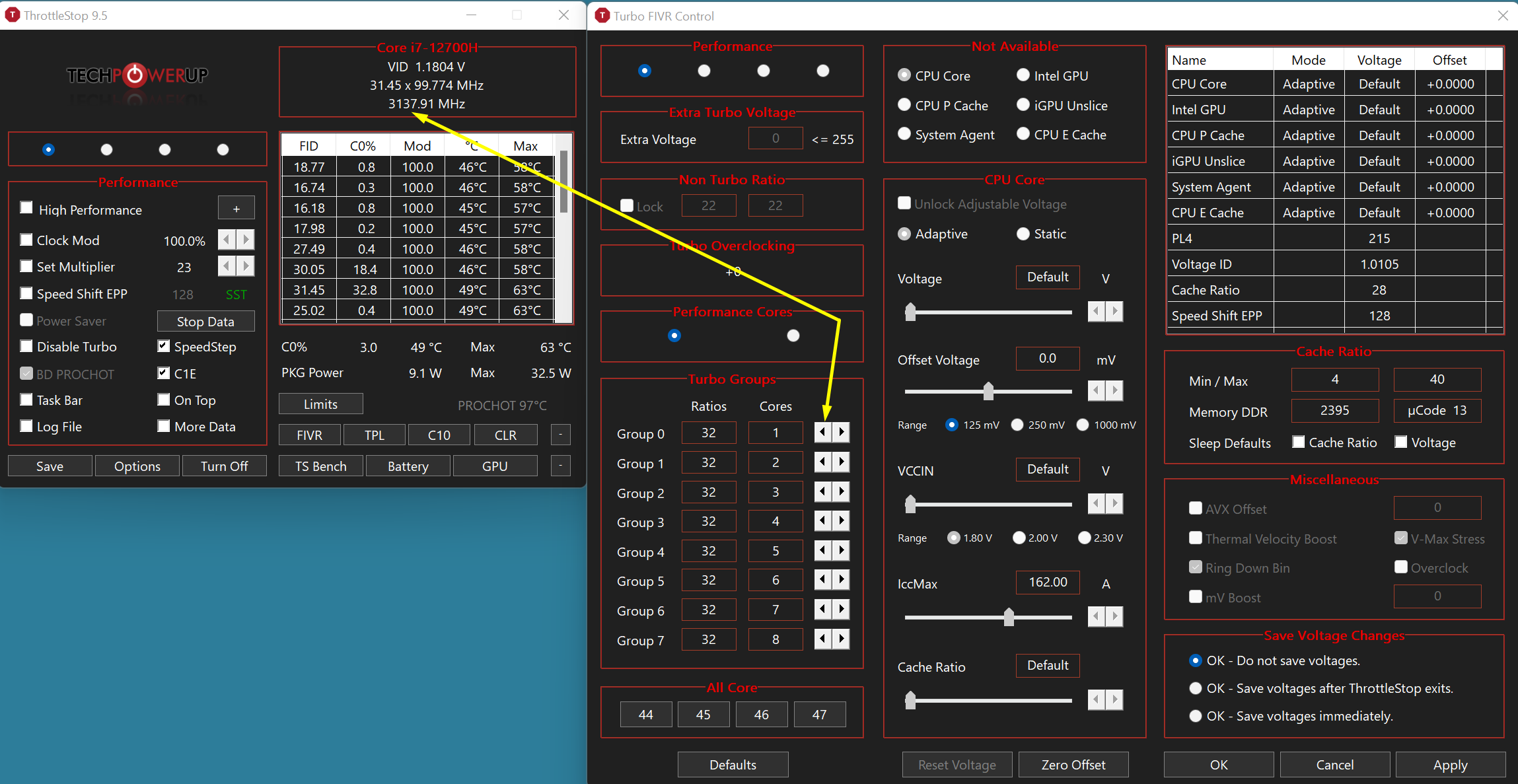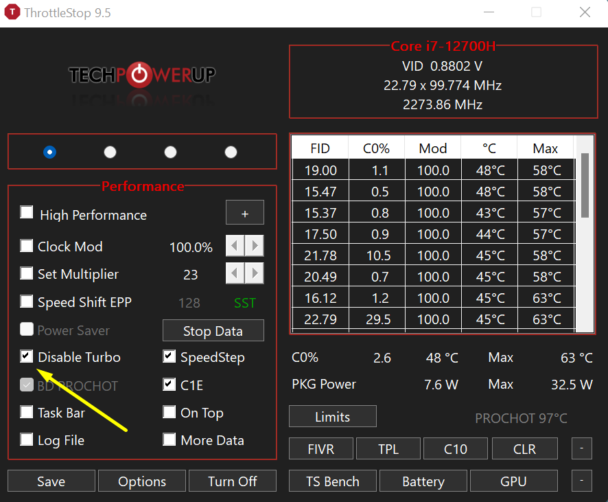 Здравствуйте, кто подскажет инструкцию чтобы через ThrottleStop 9.5 андервольтнуть ноутбучный i7 12700h уж больно он горячий, до 107 в играх.