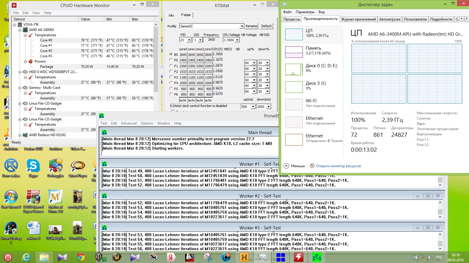 Потому немного помучал свой старый ноут Aser 7560G. Проц у него не очень быстрый 1,4ГГц, но полноценные 4 ядра еще по старой технологии 32нм и TDP - 35Вт. И так - его базовые параметры
