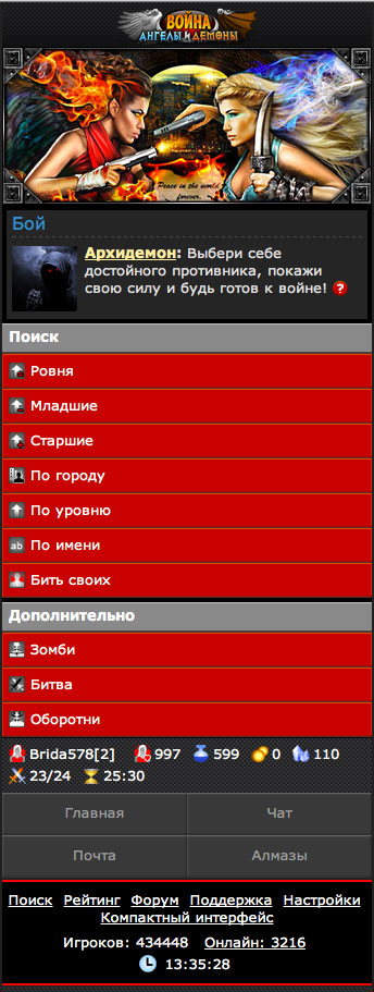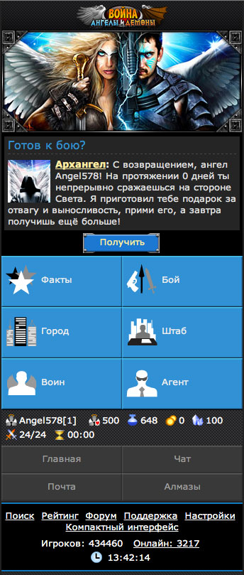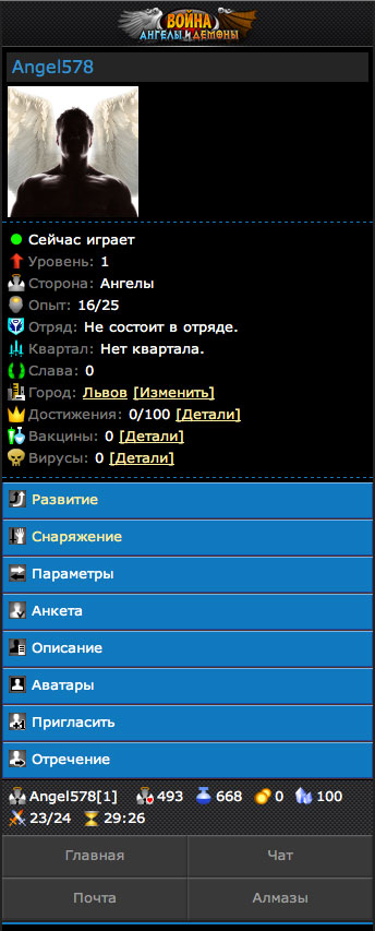 "Война: Ангелы vs Демоны" - это условно-бесплатная браузерная многопользовательская игра. Возможно играть через телефоны, планшеты, а так же и через PC.
