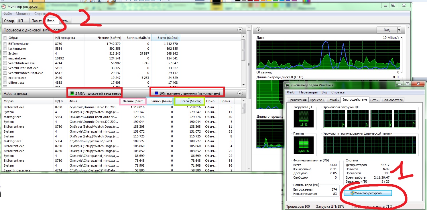 Нет определённой закономерности между просадками и повышением нагрузки на ЖД, что по показателю, где в мб/с, что по процентам, что по графику. Иногда оно просаживается немного и скачет +40%, иногда просаживается сильнее и показатели из мониторинга остаются на низком уровне