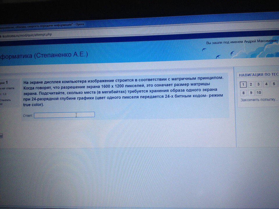 Человек, не умеющий делать скриншоты, решает информатику. А так это ж банальнейшая задачка на кодирование графики. Размер изображения 1600х1200, один пиксель кодируется 24 битами. Решаем по формуле I=K*i. При подстановке получится I=1600*1200*3(24 бита=3 байта)=5760000 байт=5625 Кбайт~5,5 Мбайт.
