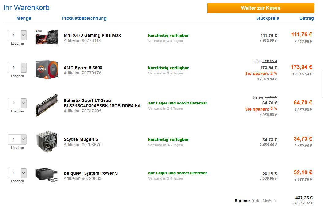 Материнскую плату заменить на B450 Tomahawk MAX, она дешевде и на первое время обойтись BOX кулером. Но я бы заказал как можно больше, не переваливая за 500 евро (больше будет, от суммы превышения 30% заплатить налога).