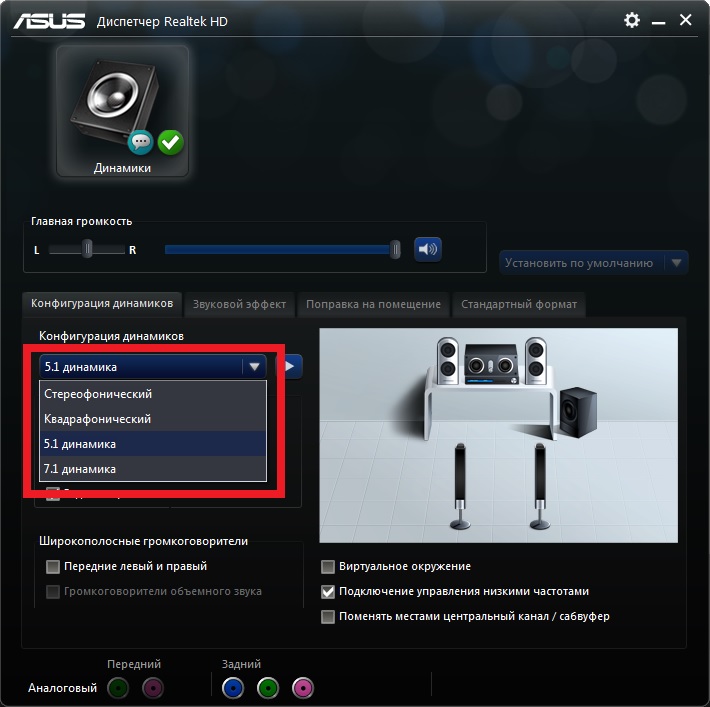 ... При подключении колонок/саба звук начинает распространяться и на них...