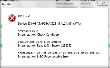 Здравствуйте, у меня возникла проблема с прогой ImgBurn. Дело в том, что через эту прогу я записываю игры на бокс360. Привод у меня Lite-On iHAS524 B прошитый. Пишу на Verbatim 8,5g. Диски резались идеально и без проблем на 100%, но в последнее время во время верификации всегда появляется вот эта ошибка