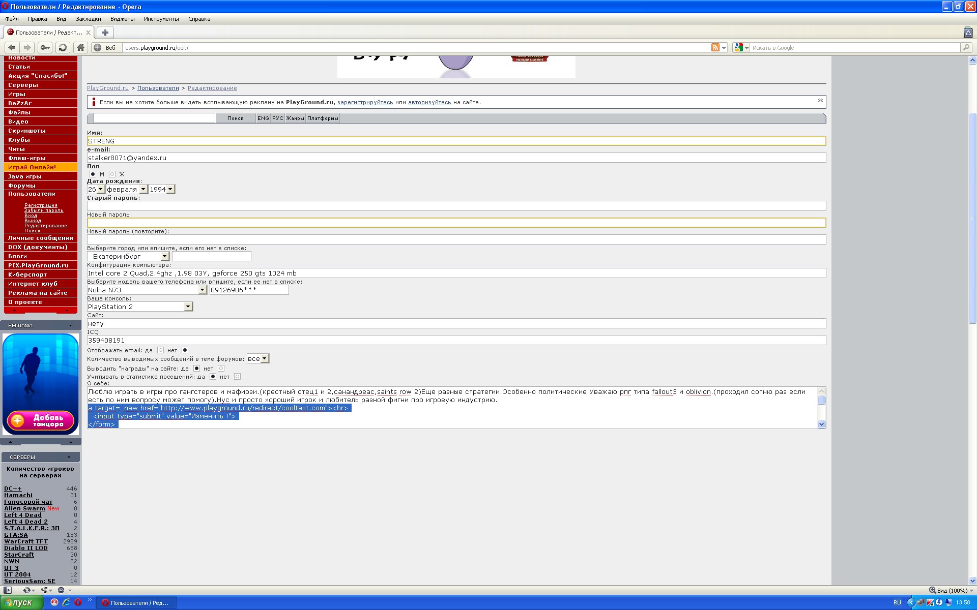 Всем здравствуйте, у меня проблема, вообщем решил я давно как-то в описании себе добавить картинку, сбросил html код и вписал его. Но как-то так получилось что скопировал не всю строчку,то есть забыл поставить перед буквой а < Теперь у меня нельзя ничего отредактировать в профиле пг. Нажимаю редактирование, а кнопки изменить нету. Что делать подскажите!