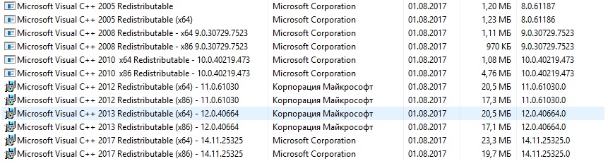 Поставь вот это: Microsoft Visual C++ 2005-2008-2010-2012-2013-2017 Hybrid x86.x64_30.07.2017. Это последняя сборка.