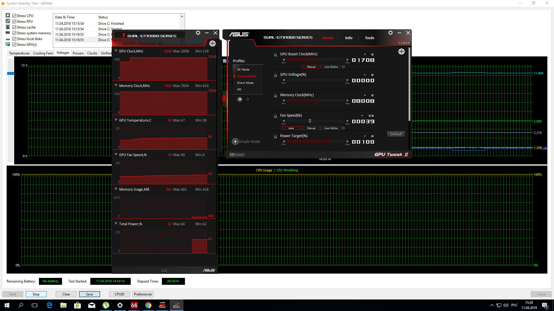 Я не шарю в компьютерах, но одно я понять не могу. AIDA грузит систему на максимум. Работает уже сорок минут. GPU Tweak показывает что карта загружена по максимуму. Черный экран не выстреливает, куллера работают в нормальном режиме. Так в чем проблемма когда я игры запускаю. Перед тестом так же вылетело. Хотя на высоких настройках мне удалось пять минут в WOT покатать, как только поставил ультра, опять черный экран и вертушки полетели. Убрал опять на высокие пару минут опять смог поиграть.