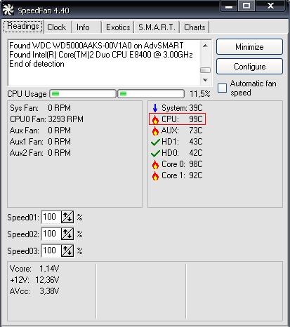Да чтобы 2-хядерный неразогнанный проц с таким кулером грелся под сотню???! Да чушь собачья! Я на Атлон 6000+(2 ядра 3 гГц, 90нм техпроцесс) ставил подобный, так он в простое 27-30, а в нагрузке выше 50-ти градусов не поднимается, это под самой максимальной! Тут либо датчики гонят конкретно (ведь проги с одних и тех же датчиков считывают инфу); либо паста высохла(наиболее вероятно), либо может прижим радиатора к поверхности проца совсем плохой(оттого и паста высохла тогда, теплообмен не происходит должным образом).